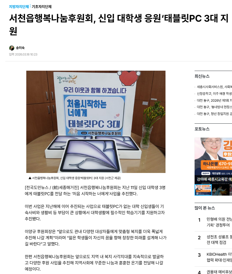 처음시작하는 너에게_태블릿PC 지원 사업 (26. 3. 17.) 페이지 정보 작성자웹마스터 조회 6회 작성일 2026-03-19 15:52:55 댓글 0 본문 처음시작하는 너에게 다음글행복듬뿍 사랑의 밑반찬지원 사업_1분기 (26. 3. 9.) 목록 댓글목록 등록된 댓글이 없습니다.