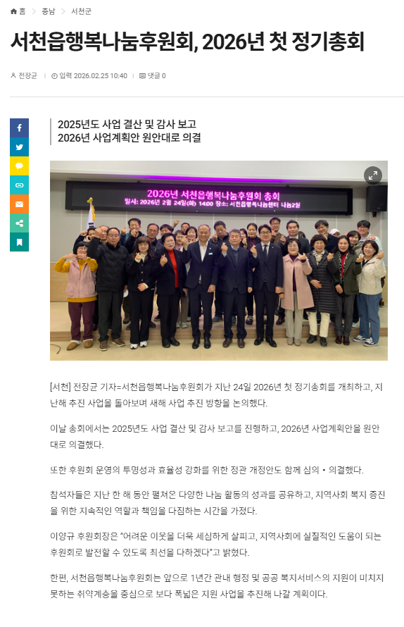 총회 (26. 2. 24) 페이지 정보 작성자웹마스터 조회 9회 작성일 2026-03-18 10:31:48 댓글 0 본문 총회 이전글 현물후원 기탁식 (26. 2. 25.) 다음글임원회의 (26. 2. 19.) 목록 댓글목록 등록된 댓글이 없습니다.